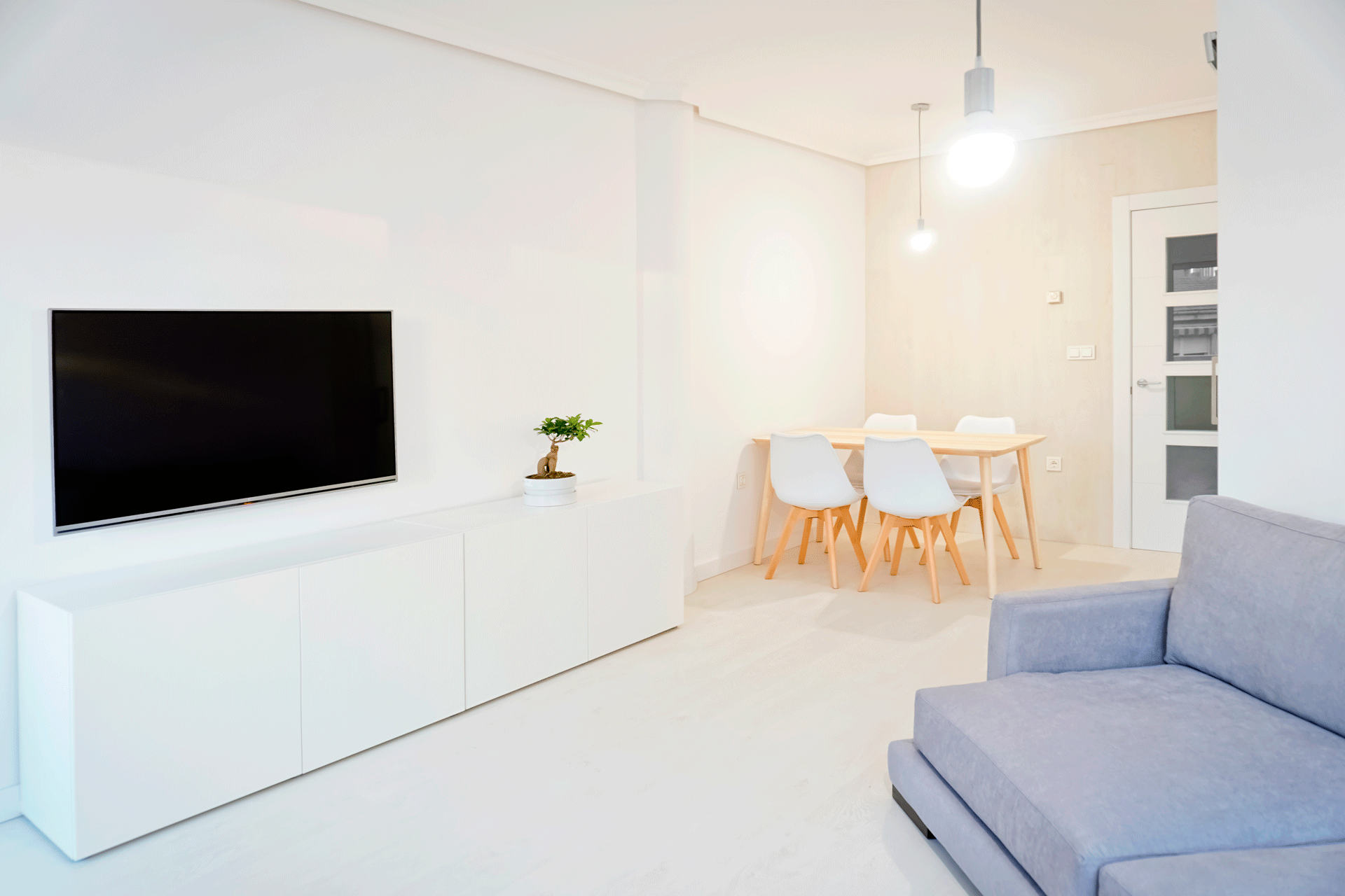 Para aportar viveza se apuesta por un contraste con los muebles de diseño y lamparas sencillas, a la misma vez elegantes y con fuerte luz de ahorro energético que sirven para completar la decoración.